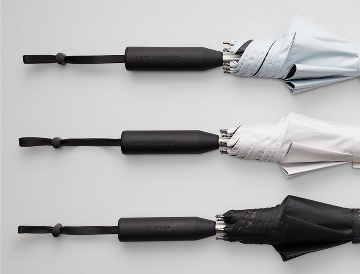 日々傘を持つことを楽しんでほしいから、傘に求められるシーンや機能を徹底的に追求しました。洋服を着替えるように、部屋の模様替えをするように、傘もその日の気分や天候、オケージョンに合わせて持ち替える。万能な1 本を持つことも効率的でよいけれど、今の気持ちに寄り添う個性豊かな傘を、それを選ぶ楽しさを、「LESS IS MORE」シリーズがご提案します。