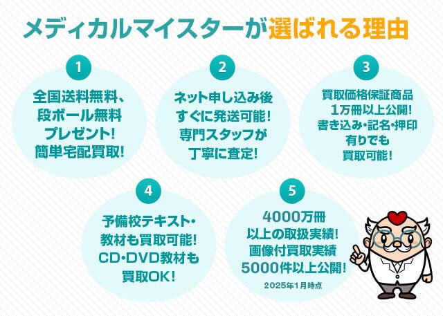 「メディカルマイスター」では、主に医学書・医学専門書の他、医療系国家試験対策の参考書・問題集や予備校テキスト・教材の買取を行っています。宅配買取で全国どこからでも送料無料。多少の書き込みがある書籍・汚れ・傷み・蔵書印などがある書籍も買取可能です。