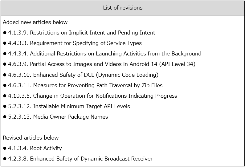 今版は、最新版のAndroid 14における変更点を中⼼に改訂された、2024年2月29日版の英語版になります。サンプルコード中のコメントも全て英語表記としています。また、セキュアコーディングとの親和性から、JSSEC選定委員による「モバイルアプリケーション開発 10大チェックポイント 2023」へのリンクについても、参考書籍として追記しています。