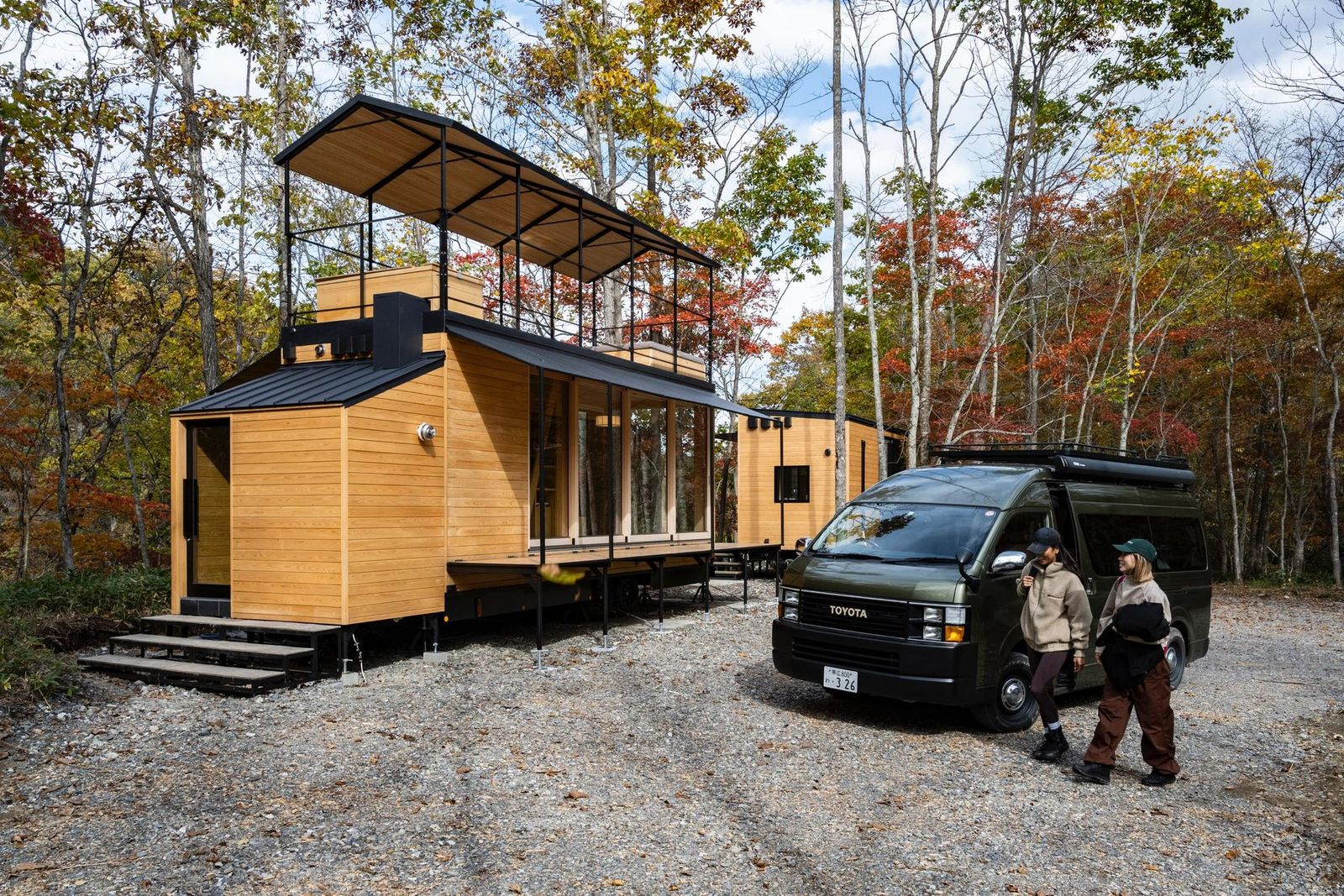 「Moving Inn Tokachi 北の森」は、2023年に北海道十勝で開業した、私たちが用意した旅のひとつの目的地です。ホテルを建てることができないほど自然が残る場所に設えた移動式の客室で、自ら火を起こし、湯を沸かし、料理をする。日常の延長にある行為を、自然の中で丁寧に味わう時間を提案しています。