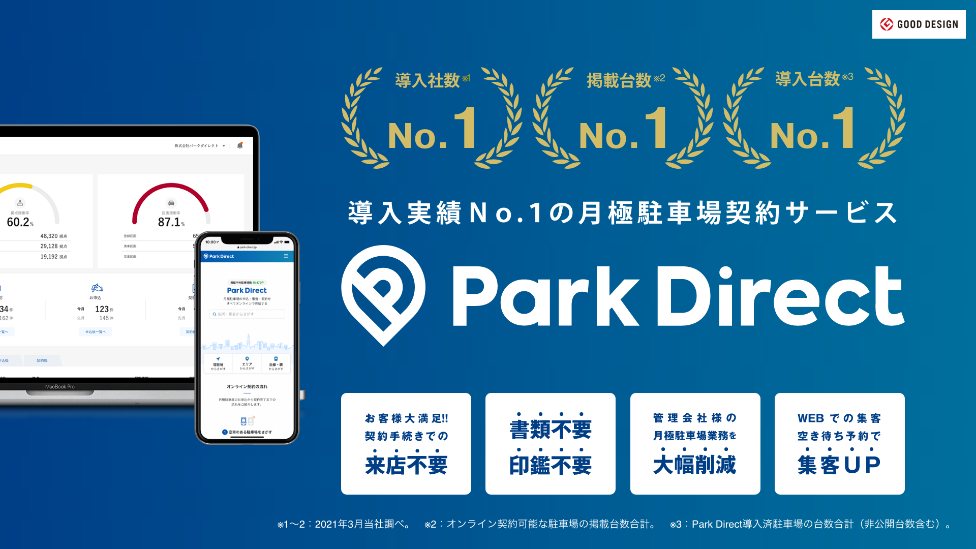 (※1)導入社数、掲載台数(オンライン契約可能な駐車場の掲載台数合計)、導入台数(Park Direct導入済駐車場の台数合計(非公開台数含む))において。2021年3月当社調べ。