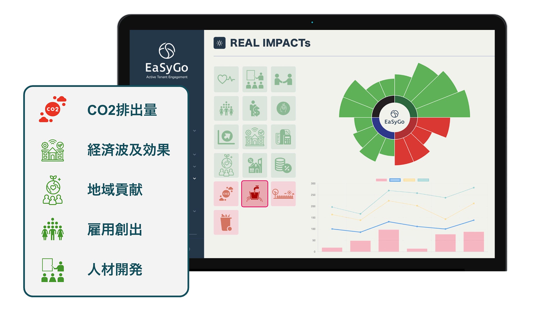 GOYOHは不動産とテクノロジーを融合させた持続可能な不動産運用サービスを提供する不動産テック企業として、機関投資家や不動産オーナーがテナントや利用者と協調して、行動変容や資本的な介入によるCO2削減やESGインパクトを創出し、不動産価値を生み出すための不動産ESGプラットフォーム「EaSyGo」を提供しています。2021年のサービス開始以来、AXA REIM社やケネディクス社などのグローバル機関投資家や不動産運用会社が運用するオフィス、住宅、商業施設、ホテル、リゾート施設へサービスを提供しています。