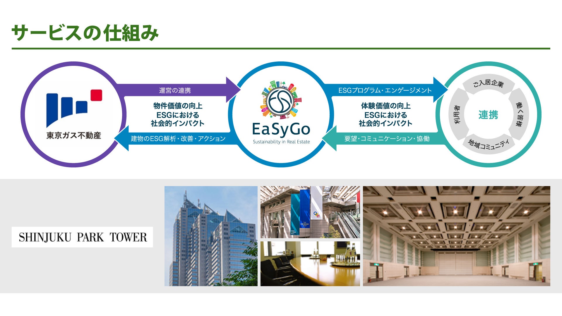GOYOHの展開する不動産ESGサービス「EaSyGo」(以下「本サービス」)を活用し、新宿パークタワーの「不動産の社会的インパクト」の可視化・解析し、テナントワーカーと協働してその効果を高める国内初*2の取り組みを行います。