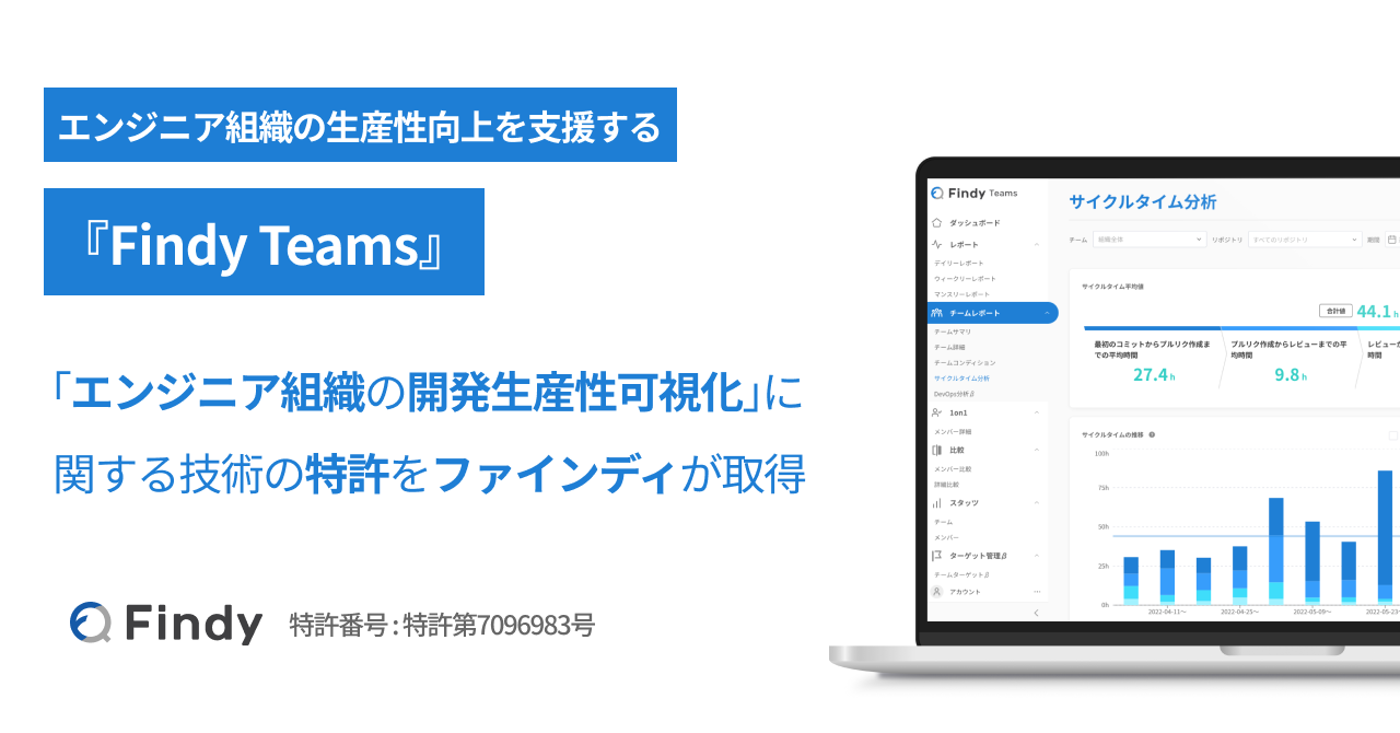 ファインディ株式会社(本社:東京都品川区、代表取締役:山田裕一朗 以下「当社」)は、エンジニア組織における開発アクティビティ・開発効率・開発クオリティを自動で可視化するサービス「Findy Teams」(現:Findy Team+)で使用されている、「エンジニア組織の開発生産性可視化」に関する技術の特許を取得したことをお知らせします。