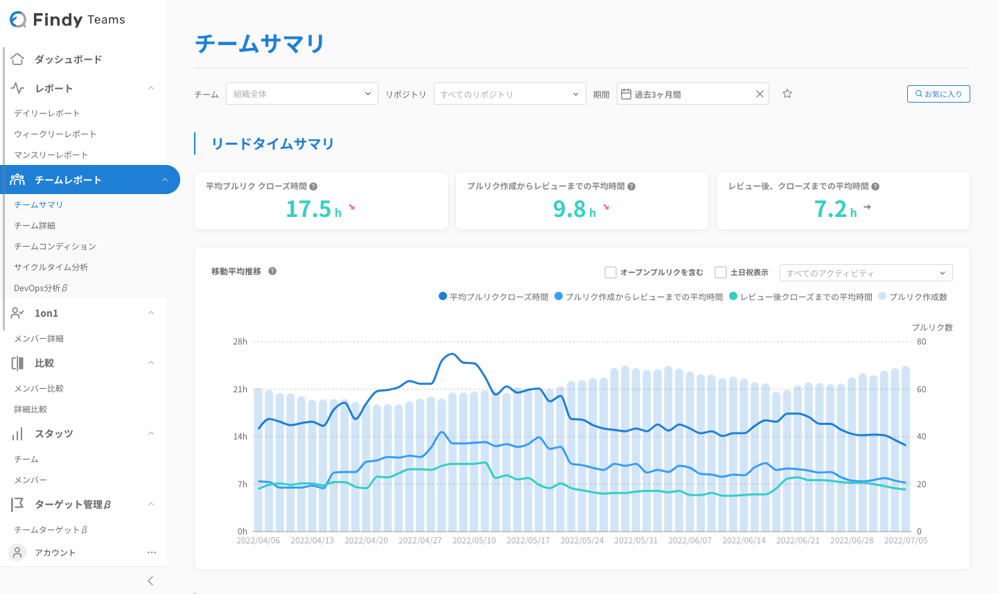 「Findy Teams」(現:Findy Team+)は、GitHub・GitLab・Jiraなどエンジニア向けツールから取得した情報を解析し、エンジニア組織における開発ボリュームやスピードについて、様々な切り口でパフォーマンスを把握するサービスです。2021年10月のリリース以降、トライアル利用企業数は100社を超えております。