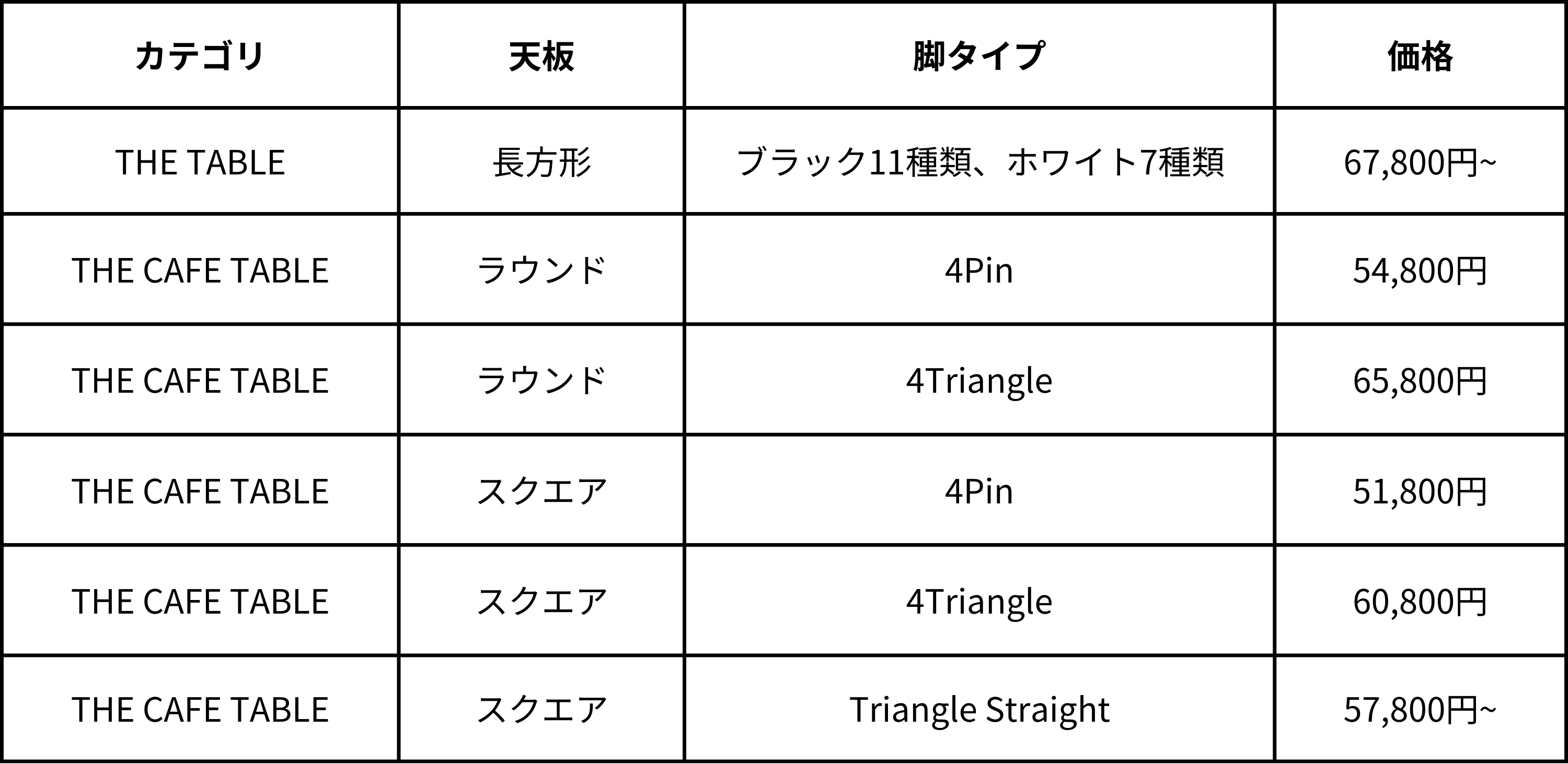 今回はTHE TABLE、THE CAFE TABLE、THE LOW TABLEの仕様を拡充しました。