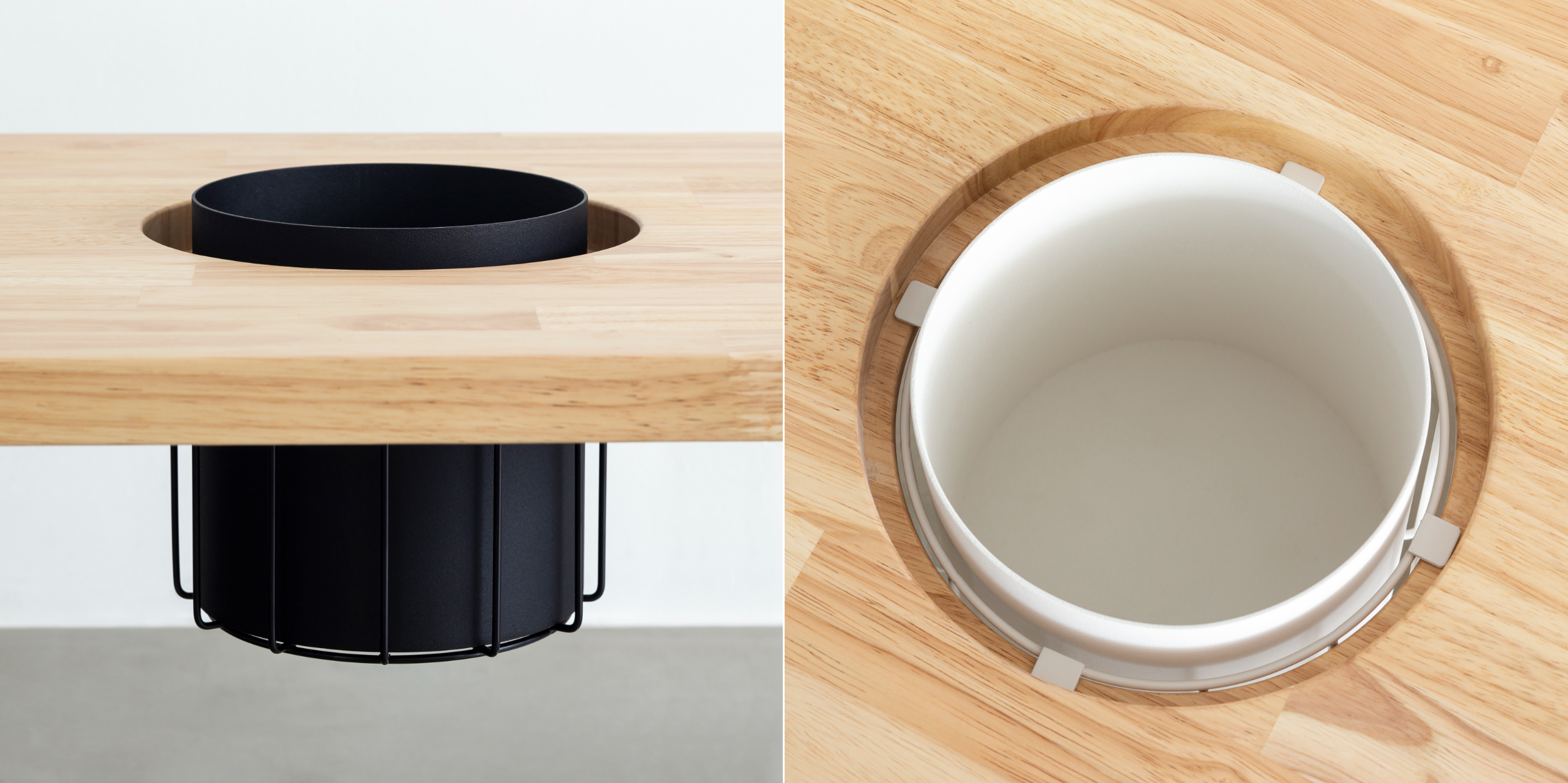 「忙しい日々の中で、心地よい自然の癒しをもっと身近に感じてほしい」という思いから、自然と調和し、生活を豊かに彩るテーブルが登場しました。テーブルの天板に直径18cmの穴を開け、「ワイヤーバスケット+鉢カバー」を設置できるシリーズです。