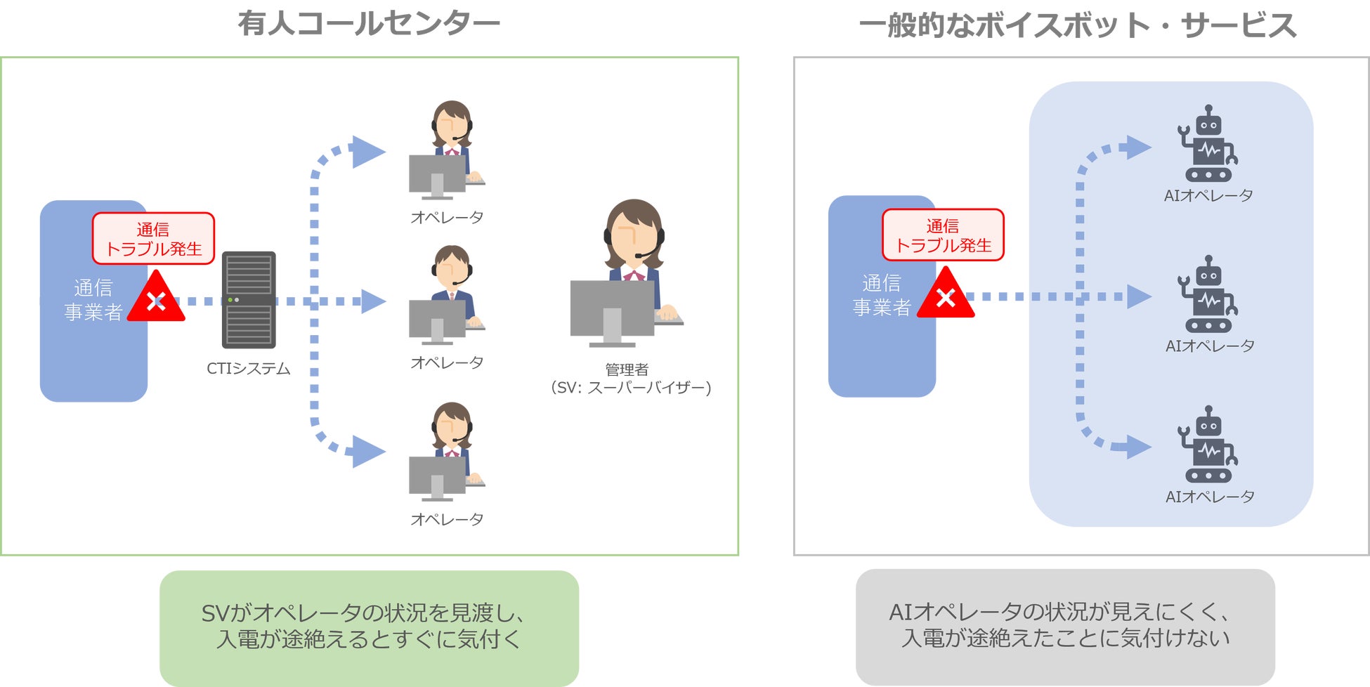 有人コールセンターでは、オペレータの管理を行うスーパーバイザー(SV)が稼働状況を物理的に見渡すことができますが、ボイスボットはクラウド環境ですべて自動稼働するため、異常な通話状態になった際には気づきにくいという課題がありました。
