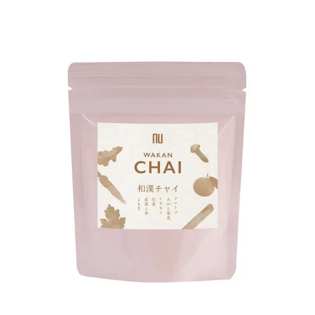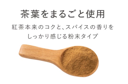 本商品は、紅茶をベースに、よもぎや高麗人参、みかん果皮、クローブなど、8種の和漢素材とスパイスを配合した粉末タイプのチャイです。茶葉をまるごと使用し、紅茶の自然な風味とスパイスの余韻がやさしく広がります。