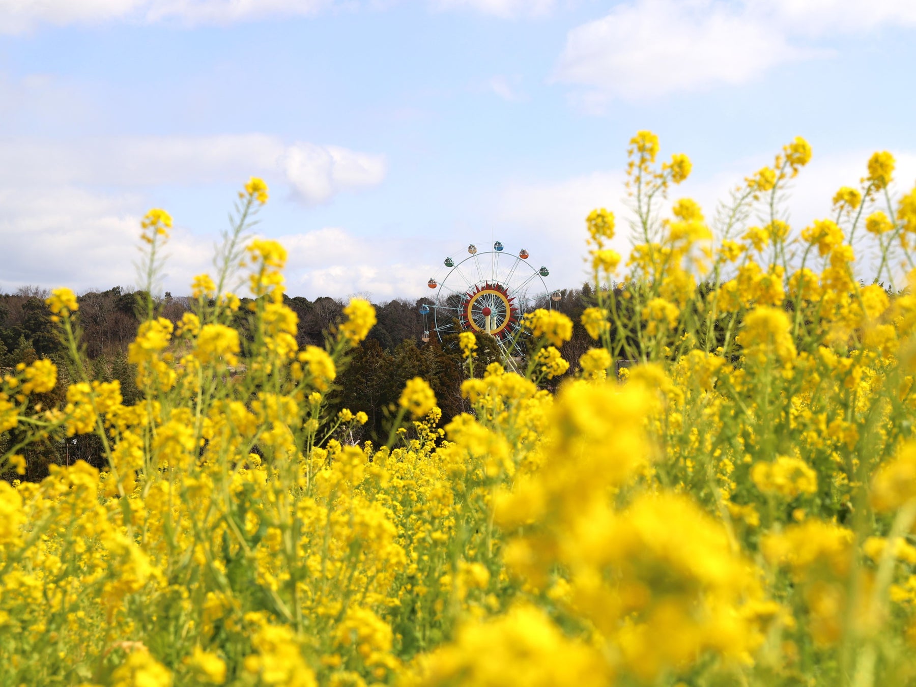約3,000㎡の花畑一面に広がる鮮やかな黄色の菜の花。晴れた日は、青空の下に黄色い菜の花が映えて絶好の写真スポットとなります。