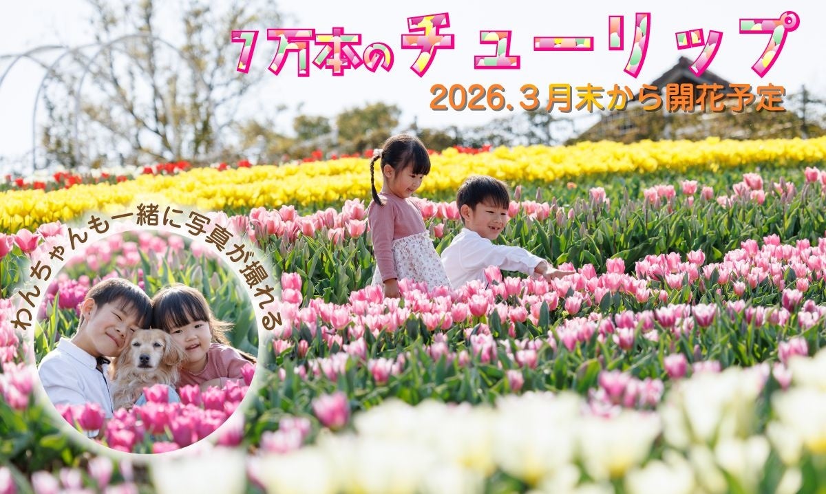 6色・7万本のチューリップが咲く花畑。まるで絵本の世界に迷い込んだかのような非日常感を味わえる春のイチオシスポットです。