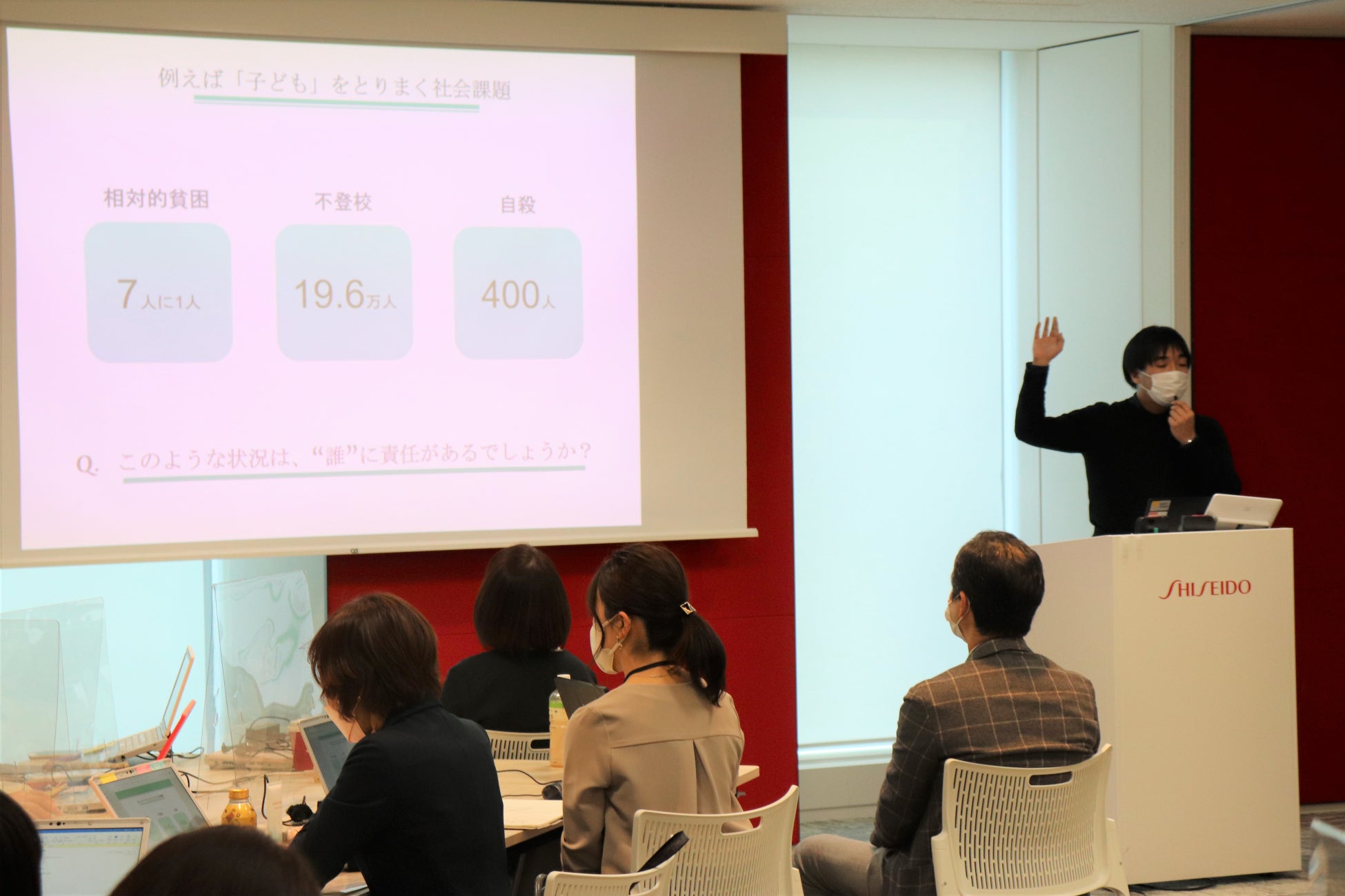 株式会社Ridilover(以下、リディラバ:代表取締役 安部敏樹)は資生堂ジャパン株式会社(以下、資生堂)が地域の社会課題に向き合う社員研修において、「守りの“社会貢献”から、攻めの“社会創造”へ」と題し、企業が社会課題解決に向き合う意義を現場視点から考察・共有しました。今回のプログラムは、社会課題を知る座学にとどまらず、研修を契機に今後の具体的なアクションを生み出すものであり、最前線で活動する現場社員が先導してESG経営を実現する取組みとして、先進的かつ大きなチャレンジといえます。リディラバは、企業の事業戦略をより「社会化」する今回のような取組みを通じて、ビジネスセクターのアップデートを今後も一層推進してまいります。