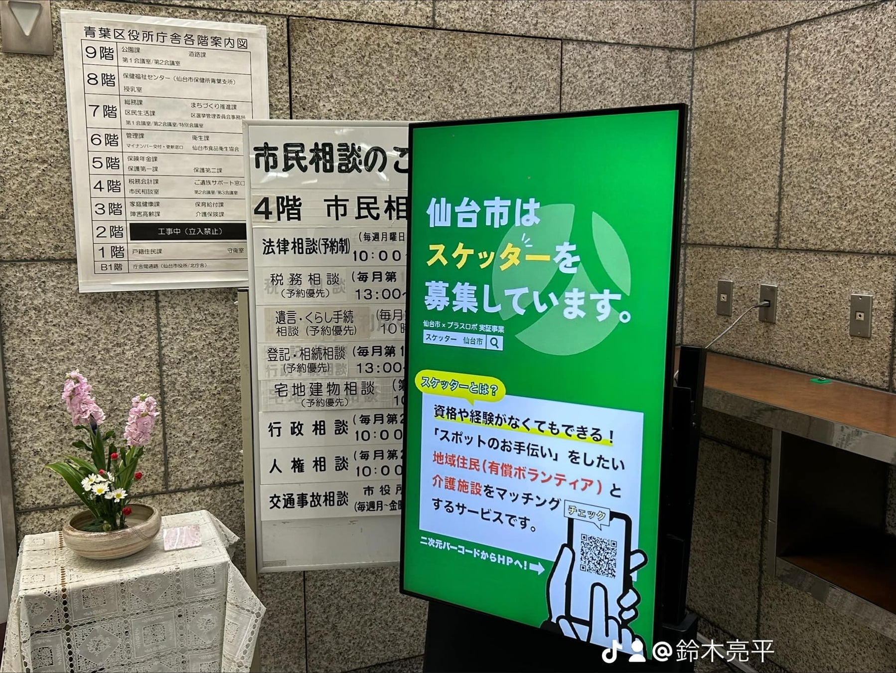 プラスロボと仙台市は、2024年10月に連携協定を締結。「スケッター」を通じて、地域資源を掘り起こし介護事業所の人手不足解消と高齢者の社会参加促進(孤独・孤立防止)、地域共生社会の実現を目指しており、仙台市は2025年の2月から市民に対して大規模周知を開始している。