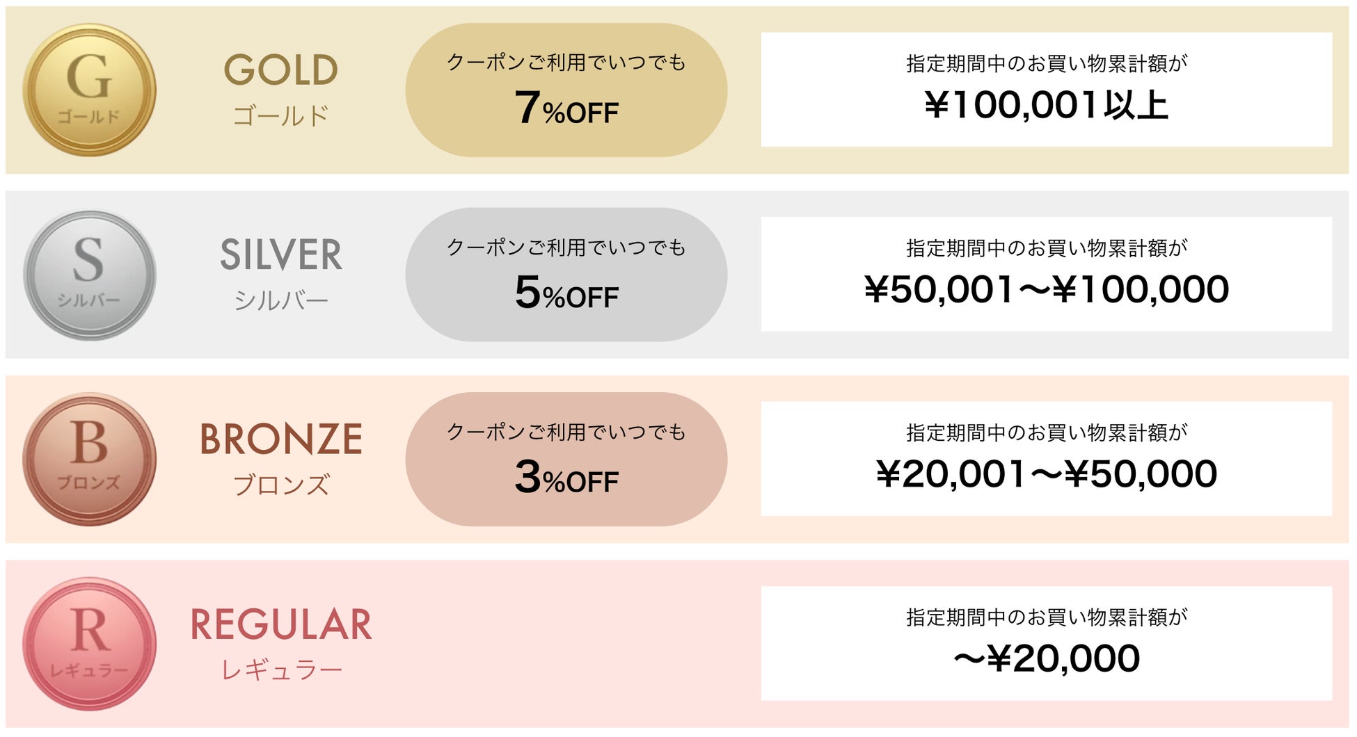 毎年2/1~翌年1/31の期間中の累計お買い物金額に応じて、翌年3/1~のステージが決定し、ステージに応じた特典をご用意いたします。