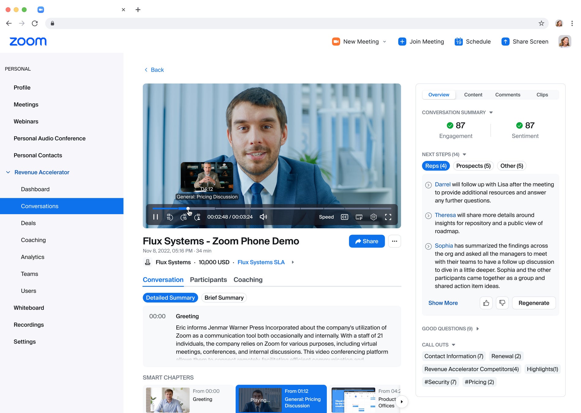 現在 Zoom Revenue Accelerator は、ミーティング要約、チャプター要約、センチメント(感情)、エンゲージメント、トーク/リスニング比率、次のステップや適切な質問のインテリジェント自動抽出、営業ミーティングのフォローアップを支援するメールスマート作成機能など、数多くの AI 機能を備えています。Zoom はこれらの機能を継続的に拡張し、新しい AI 機能を追加することによって収益チームのスキルアップと継続的なパフォーマンス向上を可能にし、カスタマー エクスペリエンスと収益の向上につなげていく計画です。