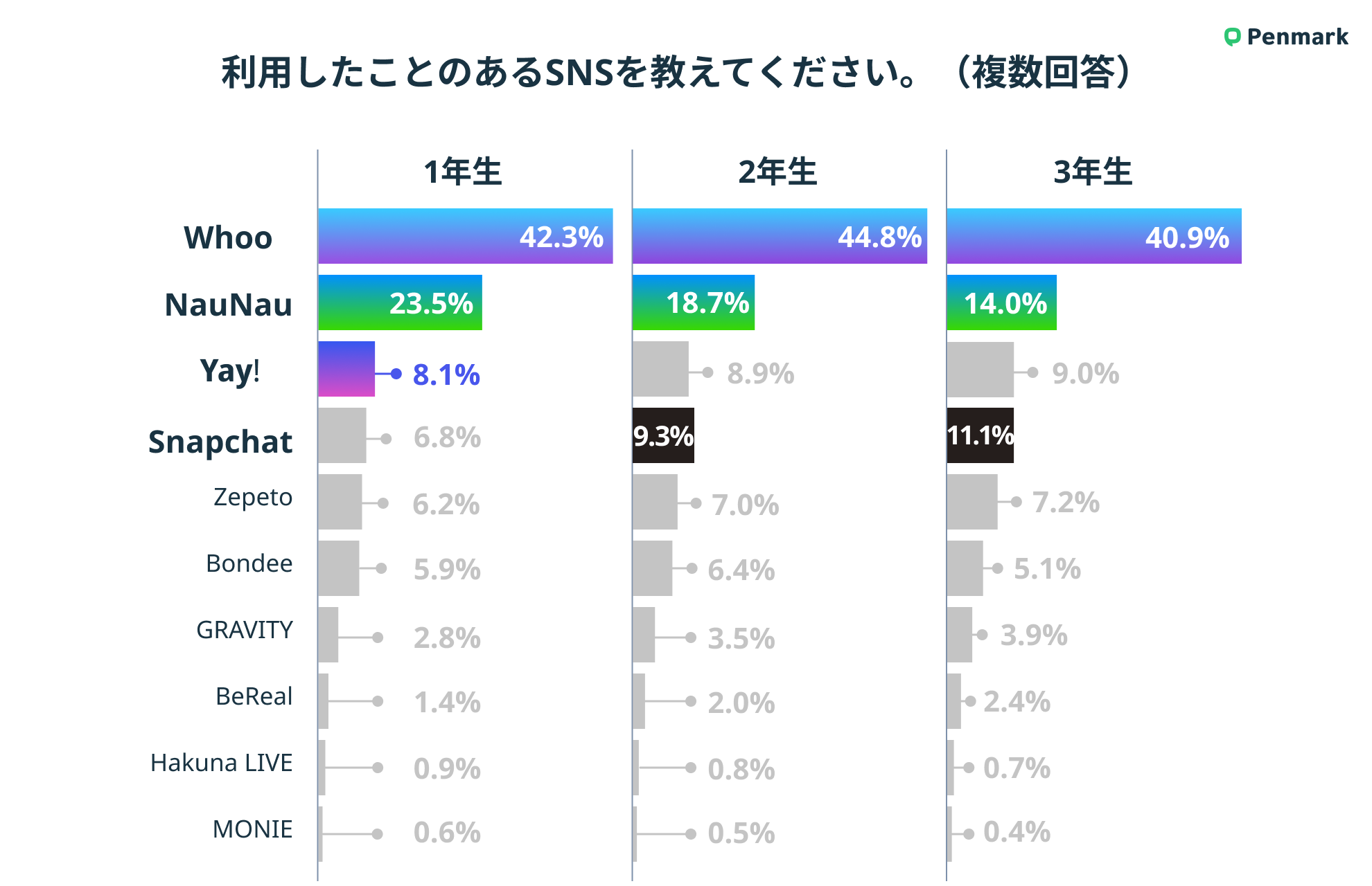 全体で2位の「NauNau」の利用率は高校1年生が23.5%と最も高いが、学年が上がるにつれて減少。特に、1年生と3年生では5.6%の差となった。