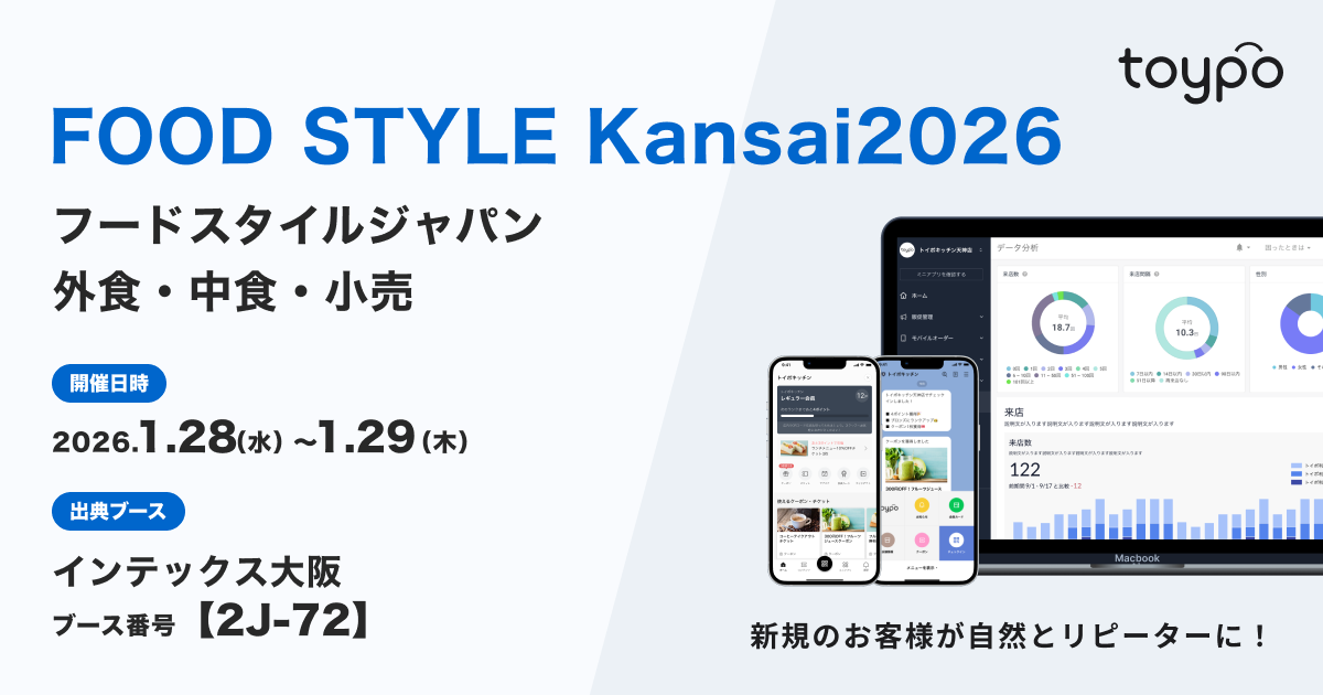 行動のきっかけを生み出す顧客体験プラットフォーム”toypo” を提供する株式会社トイポ(福岡市中央区、代表取締役:村岡 拓也、以下「トイポ」)は、2026年01月28日(水)~29日(木)にインテックス大阪 1・2号館で開催される「FOOD STYLE JAPAN 2026 <関西>」に出展いたします。