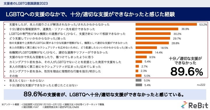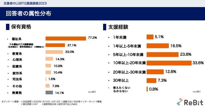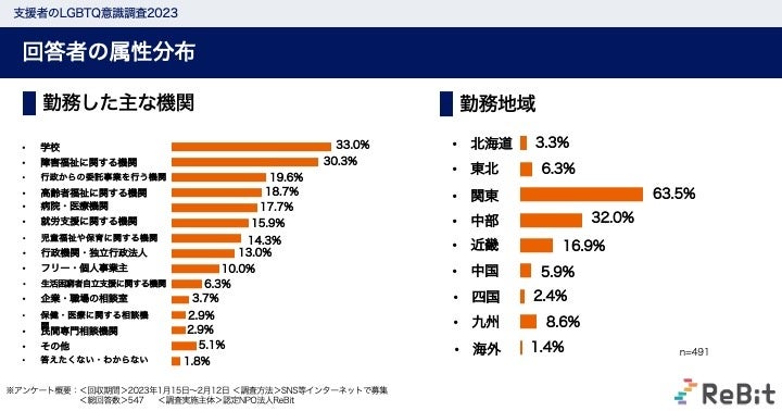 ReBitは、支援者のLGBTQに関する意識や支援機関の状況に関する調査を実施。支援者547名が回答し、支援機関のLGBTQに関する取り組みの不足、特に福祉や医療等の分野における顕著な遅れが明らかに。
