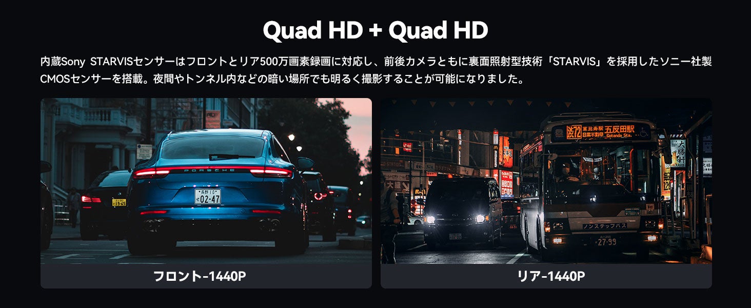 また、ソニーの日本製センサーSTARVIS IMX335 5MPセンサーを内蔵し、前後にQuad HD 1440P 30fpsのカメラを搭載しており、WDR技術を使用して朝晩関係なく明るく見やすい映像になります。偏光フィルター(別売)を使用すると、ダッシュボードの映り込みを大幅に防ぐことができ、高画質の映像でドライブの思い出を鮮明に撮影することができます。