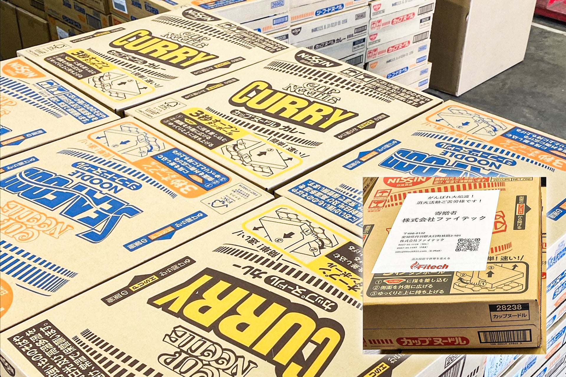 過酷な消火活動を行う消防隊員の皆様を支えたいという思いで、カップラーメン1,744個を支援物資として寄贈