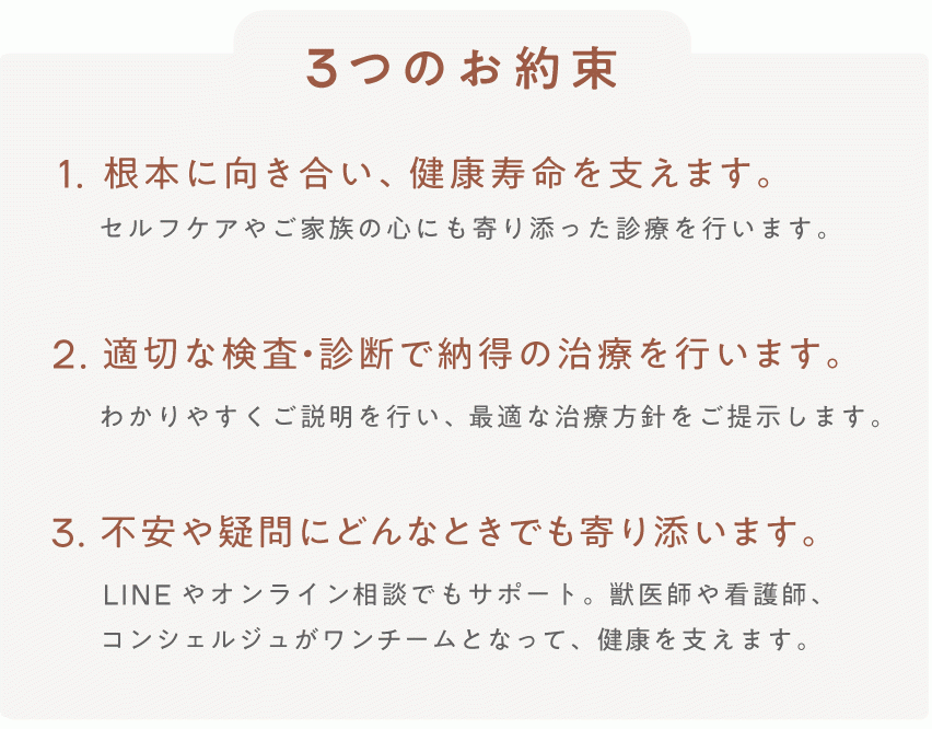 LINEやオンライン相談でもサポート。獣医師や看護師、コンシェルジュがワンチームとなって、健康を支えます。