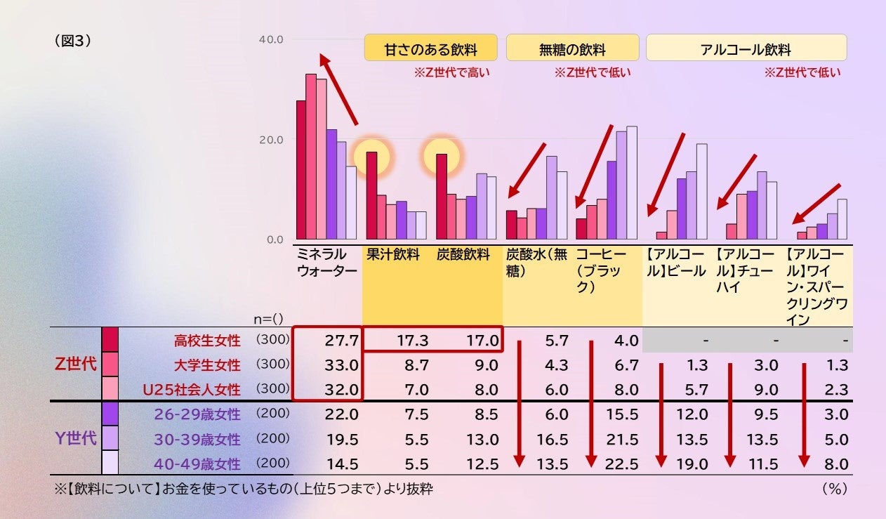 一方、その他の無糖飲料である「炭酸水(無糖)」「コーヒー(ブラック)」をあまり飲んでいないようです。例えば「果汁飲料」はY世代と比較すると飲用されている傾向があることや、Z世代のSNS上ではスタバの新作(カロリー控えめとはいえない)を好んで試している様子などが散見されることから、根底には彼女たちは甘い味覚が好みであり、無糖の飲料は、味以外で彼女たちの琴線に触れる別のベネフィット(美容健康に良いやSNSで友人と話題にできることなど)がないと、購入に意識が向きにくいのでは、と考えられます。