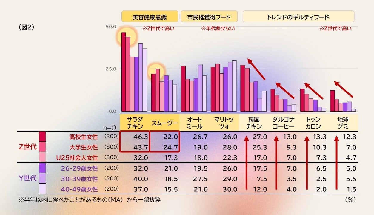 一方で、ギルティフードへの誘惑に弱く、普段の節制からの反動か試してみる機会も多いことがわかります。 Z世代は、SNSなどを活用して食の流行やトレンドの情報収集力が高いので、魅力的な新商品を試してみたくなる機会が多いのかもしれません。チートデイにはギルティフードを、それ以外の日常では健康や美容を重視した食生活を実施するといったメリハリ意識が、Z世代の食意識のようです。