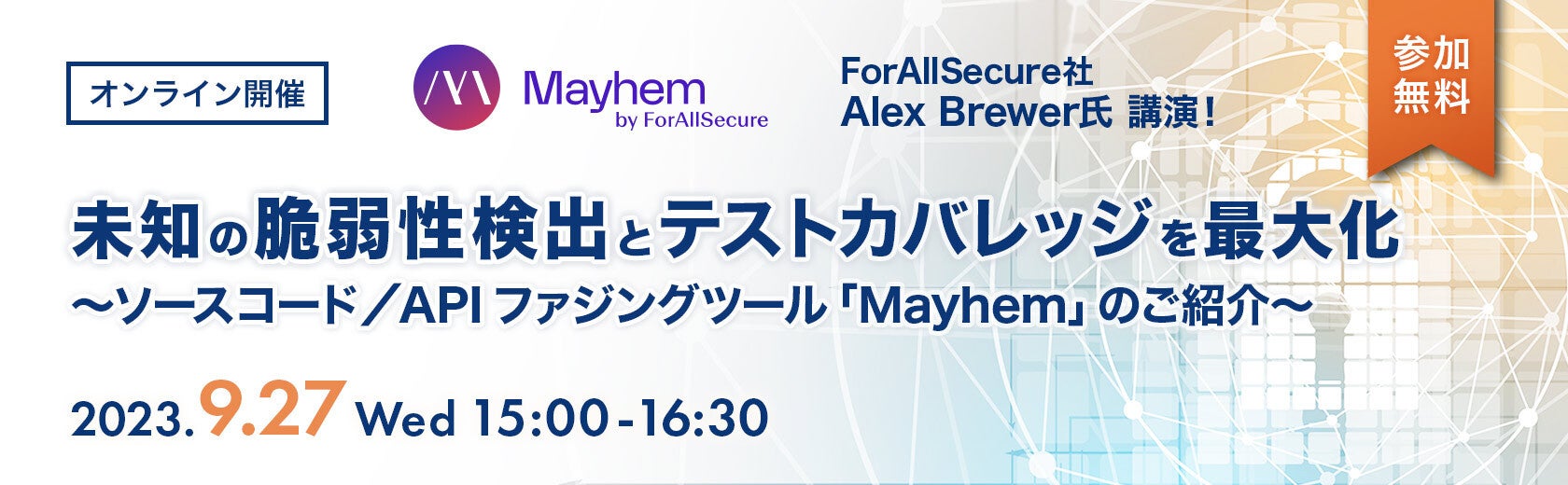 ファジング活用の動向や多様なビジネス環境のセキュリティ品質を支える当社の取り組み、およびソフトウェア開発の効率化と堅牢性の向上に貢献するソースコード/APIファジングツール「Mayhem」をご紹介するオンラインセミナーを9月27日(水)に開催いたします。