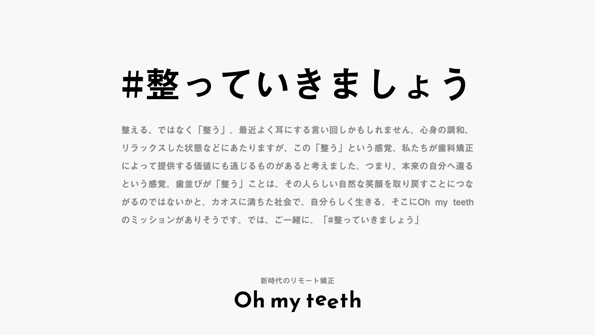 整える、ではなく「整う」。最近よく耳にする言い回しかもしれません。心身の調和、リラックスした状態などにあたりますが、この「整う」という感覚は、Oh my teethの「歯科矯正によって提供する価値」と、マッスルデリの「食事によって提供する価値」にも通じるものがあると考えました。