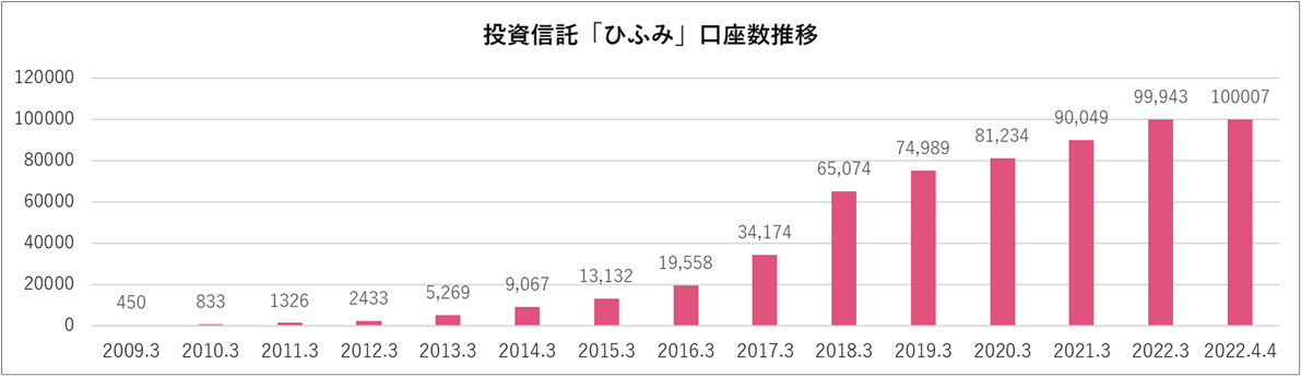 これまで多くのお客様に資産形成のパートナーとしてひふみをお選びいただいた結果、このたび10万口座に到達することができました。改めてお客様、関係者の皆さまには役職員一同、感謝を申し上げます。