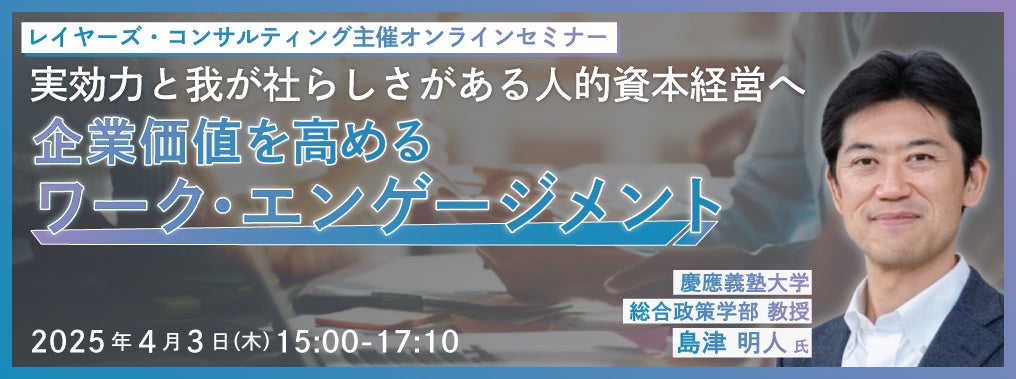 株式会社レイヤーズ・コンサルティング(東京都品川区、代表取締役CEO:杉野 尚志、以下:レイヤーズ)は、オンラインセミナー『実行力と我が社らしさがある人的資本経営へ 企業価値を高めるワーク・エンゲージメント』を2025年4月3日(木)に開催することを発表いたします。