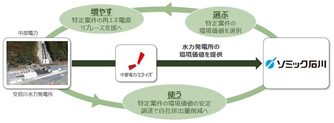 本契約に基づき、ソミック石川は中部電力ミライズが提供するオフサイト型バーチャルPPA※1サービスを活用し、安倍川水力発電所(静岡県静岡市葵区)からRE100の基準※2を満たす再生可能エネルギー由来の環境価値(非化石証書)を調達いたします。これにより、ソミック石川の工場で使用する電力の環境負荷を実質的に低減し、年間で約2,700 トン相当のCO₂排出量削減効果が見込まれます。