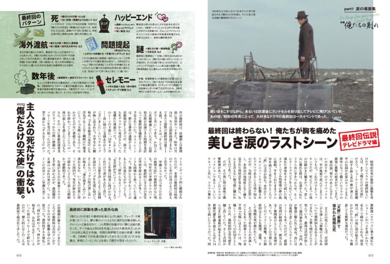 【part 1】「涙の場面集」では、「最終回伝説」と題して、テレビドラマ、特撮ヒーロー、アニメ、マンガの最終回を紹介。映画については「別れの場面伝説」としてクライマックスシーンを紹介しています。テレビドラマ編では『傷だらけの天使』や『日本沈没』、特撮ヒーロー編では『ウルトラマンA』や『スーパーロボット レッドバロン』などに言及。さらに、各ジャンルについてライター陣や編集部員が選んだ最終回ベスト3も、バラエティ豊かなタイトルが挙がっており要チェック。ぴったり趣味の合うセレクトも見つかるかも?