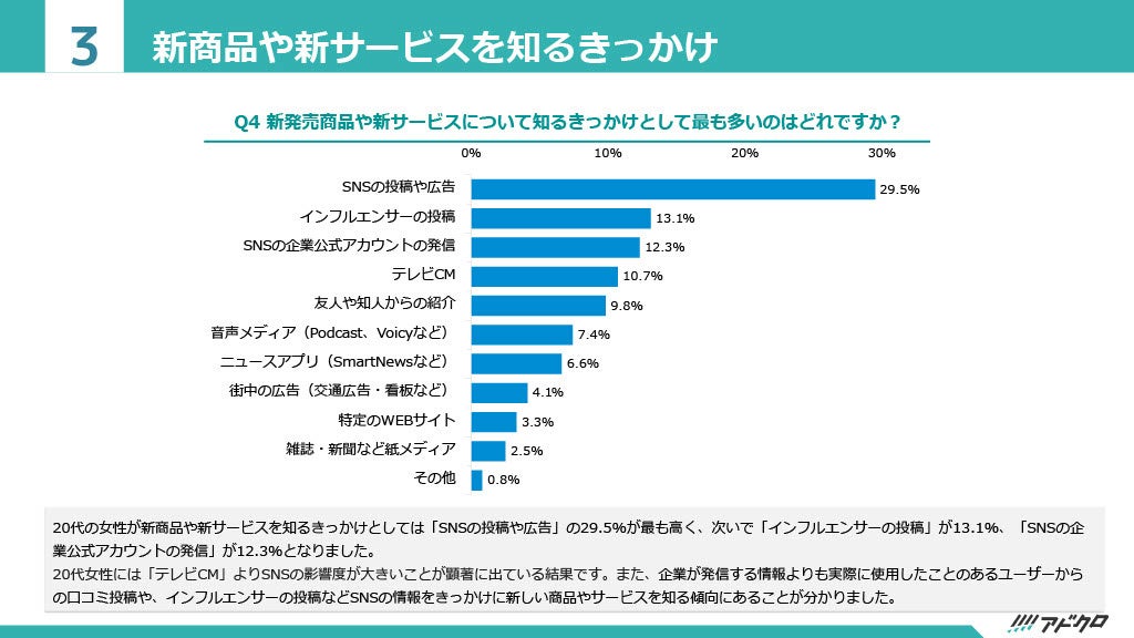また、新発売商品や新サービスについて知るきっかけについては、「SNSの投稿や広告」の29.5%が最も高く、次いで「インフルエンサーの投稿」が13.1%、「SNSの企業公式アカウントの発信」が12.3%となりました。