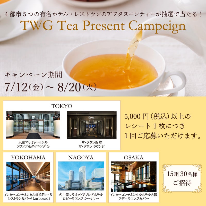 【キャンペーン】高級ティーブランドの『TWG Tea』が「有名ホテル・レストランのアフタヌーンティーがあたる!TWG Tea プレゼントキャンペーン」を2024年7月12日(金)から開催。