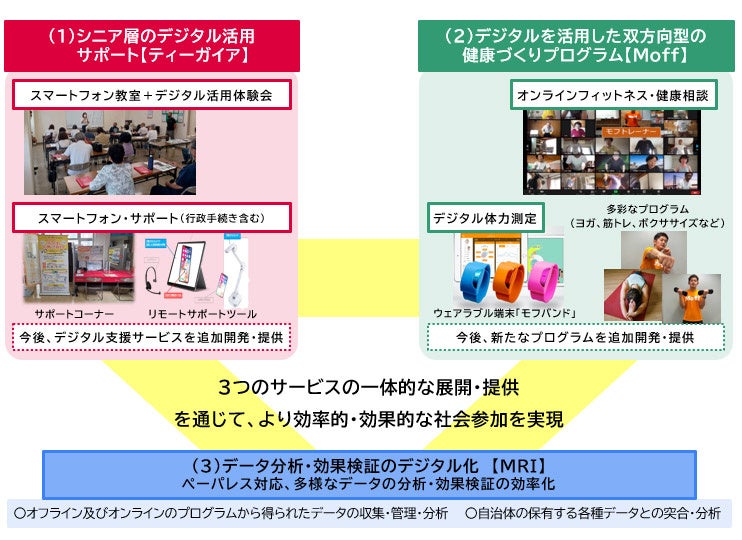 MRI・ティーガイア・Moffの3社は、各社の実績・強みを活かして、シニアの社会参加の促進につながる「デジタル活用」と「健康づくり」の融合サービスを、4月3日から自治体向けに提供します。