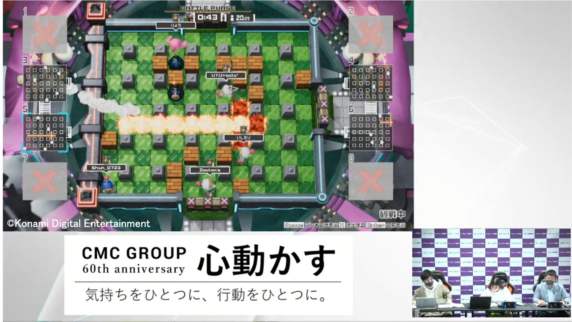今回使用したタイトルの一つは、『スーパーボンバーマン R オンライン』です。社員だけでなく、そのご家族のみなさんにも楽しんでいただけるタイトルとして採用しました。最大64人が同時対戦できるという特徴を活かし、当日に121人の参加者を4つのグループに分けて予選を実施。それぞれの予選を勝ち抜いた8人が決勝戦で競い合いました。eスポーツキャスターの央川跳惟(おうかわとうい)さんの実況により大変盛り上がりました。