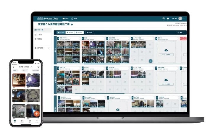 「Proceedクラウド」は工程写真を基に製造情報データベースを構築することで、分散していた生産情報を集約し、製造状況の可視化を行うサービスです。モバイル端末での写真整理・保存機能、写真一覧画面への工程情報の表示機能、写真への書込み機能などにより、業務効率化、遠隔での製作進捗状況の把握、技能継承の基になるデータベースの構築を実現しています。