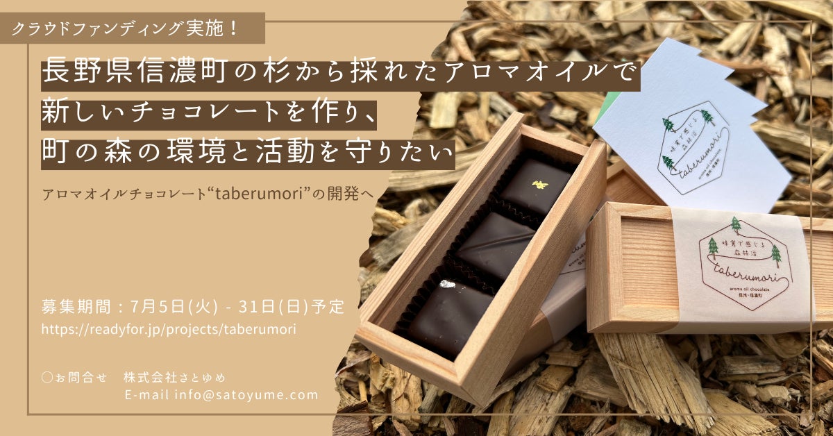 全国各地で地域活性化やビジネス創出を伴走支援する株式会社さとゆめ(代表取締役:嶋田俊平)は、持続可能な森づくりへの貢献を目指し、長野県信濃町の無花粉杉の葉から抽出したアロマオイルを使用したチョコレート“taberumori”の販売を、2022年7月5日(火)正午よりクラウドファンディングサービスREADYFORにて開始いたしました。