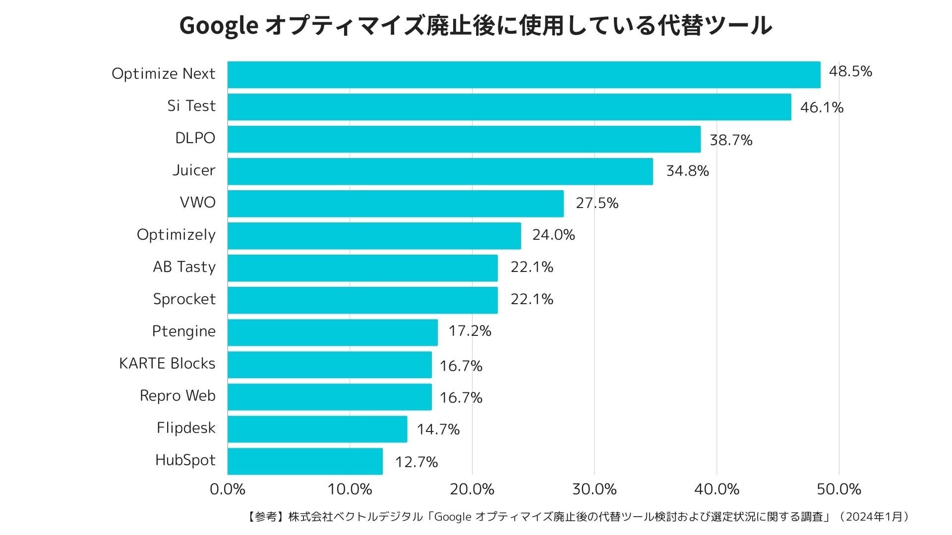 (※1)株式会社キーワードマーケティング,2024.02.08,「Google オプティマイズ廃止後の代替ツール検討、選定状況に関する調査結果」,株式会社キーワードマーケティングホームページ,(2024.02.20,https://kwmlabo.com/research-release/1497/#index_id6).