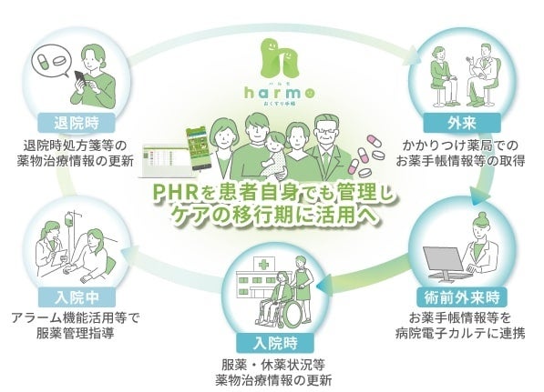 (*1…harmo医療機関向けシステムとは、患者さんが「harmoおくすり手帳」に入力した服薬情報などのPHRを医療機関で閲覧できるシステムのこと。)
