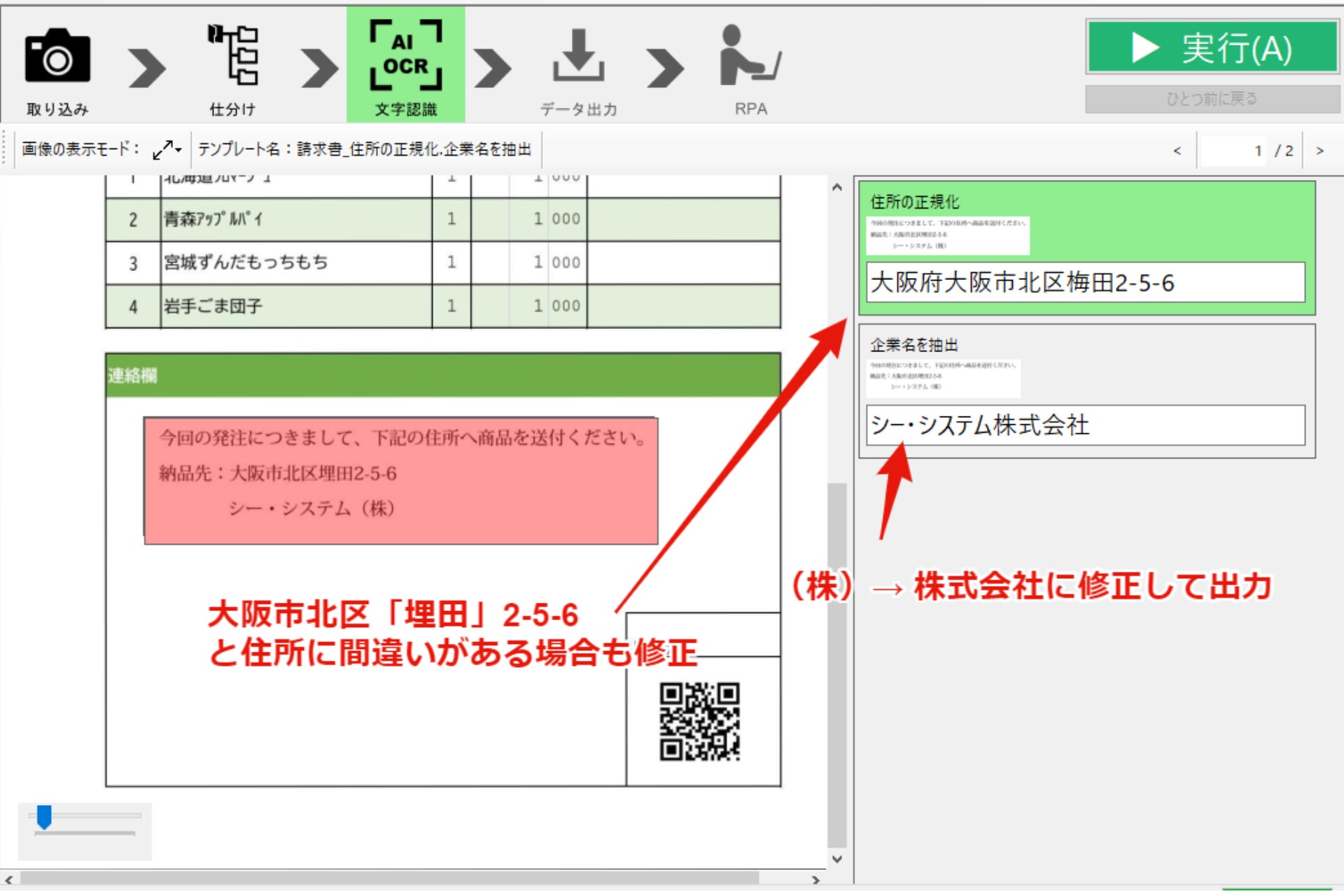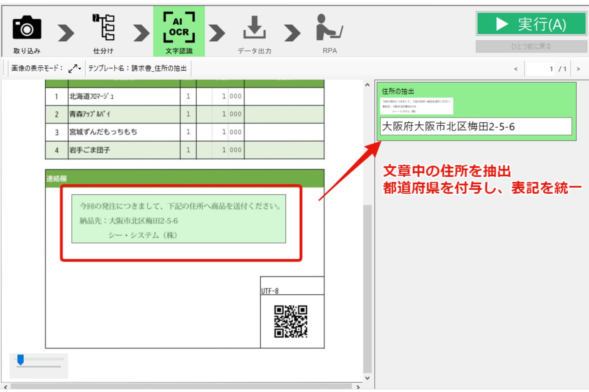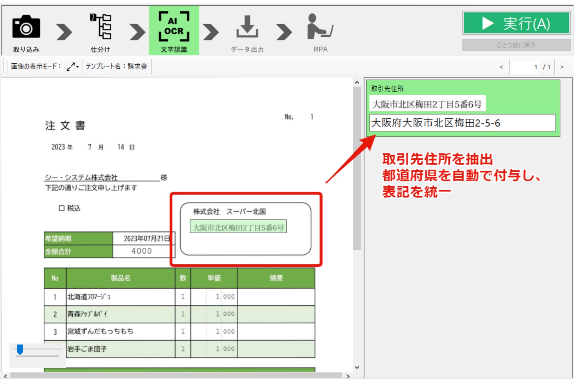 注文書に記載された取引先の住所を文字認識し、都道府県や番地を自動補完した上で、住所を特定の形式で出力します。取引先リストや業務システムにそのまま反映でき、手入力や修正の時間を削減します。