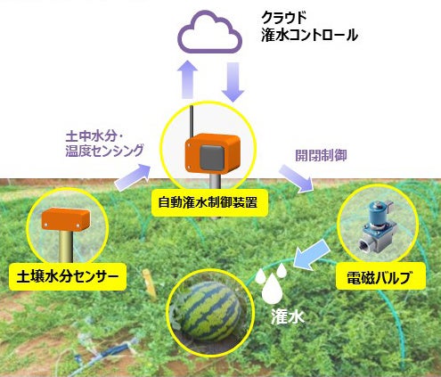 このたびの弊社の開発供給実施計画の概要は、スイカの屋外栽培における潅水管理作業時間を大幅に削減する、土壌水分センサに基づく自動潅水システムの開発と供給を促進するものです(図参照)。当システムは土壌の透磁率の特性を活用した土壌水分センサのセンシングデータをワイヤレスネットワークでクラウドに蓄積、AI学習で最適な灌水パターンを学習させ、電磁バルブの開閉を行い自動で灌水をします。当システムは屋外使用に耐えうる防水防塵機能を有し、土壌水分センサは土壌の透磁率の特性を活用することにより、水分ムラの大きい場所でも広範囲で正確な測定が可能なため、砂丘地での生産にも適しています。これらの自動灌水技術を活用することで、20%の労力軽減を図ることを目標としており、今後は、スイカ同様石川県の特産であるサツマイモや、砂丘地で生産されるダイコン等にも応用していく予定です。