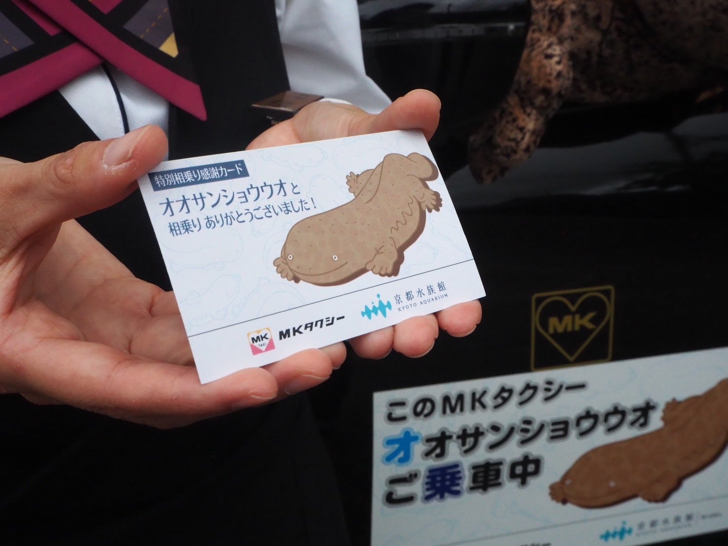 オオサンショウウオタクシーは、155cmのオオサンショウウオのぬいぐるみがタクシーに乗車し、ドライバーと一緒に運行する京都水族館とのコラボタクシーです。