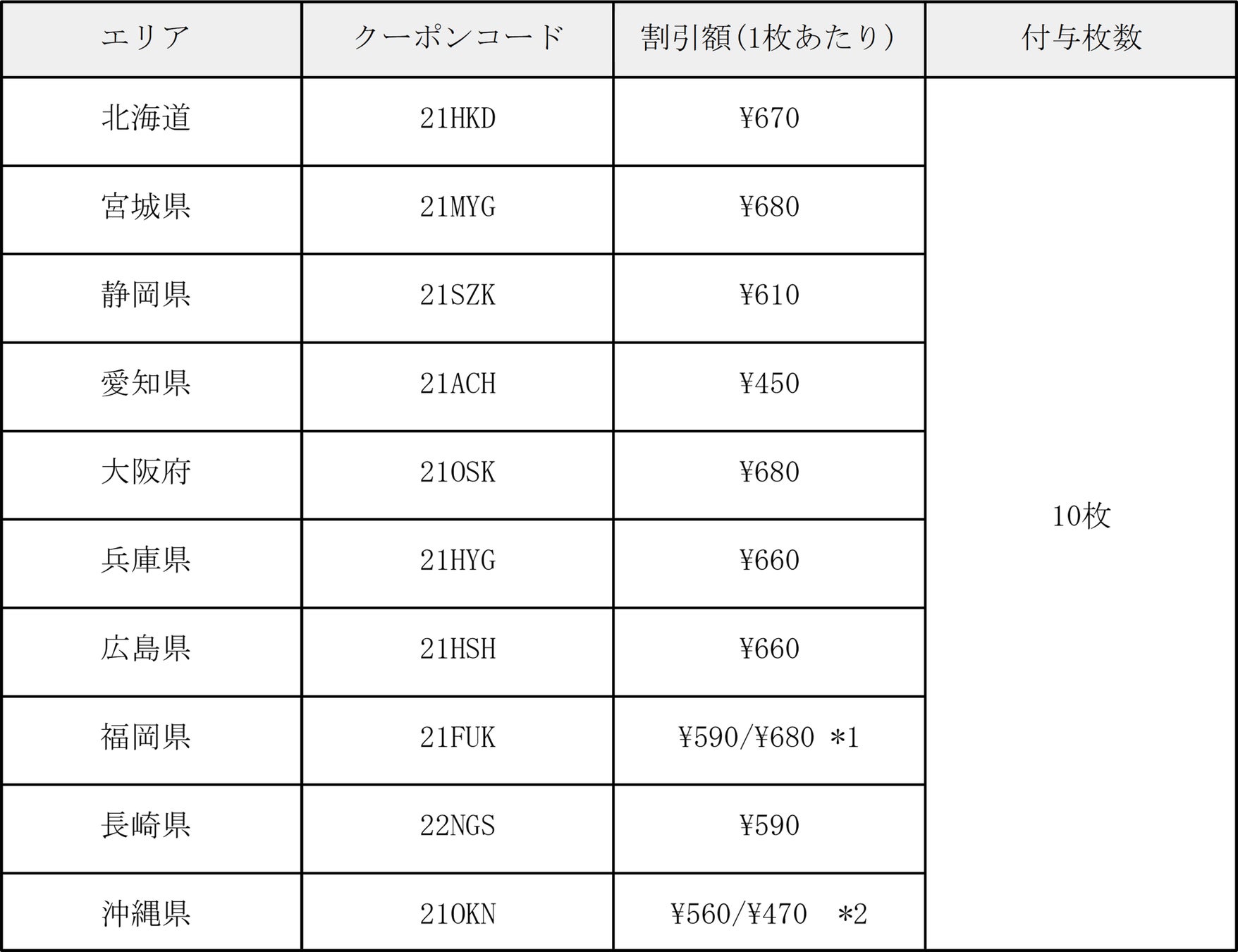 *1,2 各エリアごとに10枚のクーポンが付与され、合計20枚のクーポンを付与