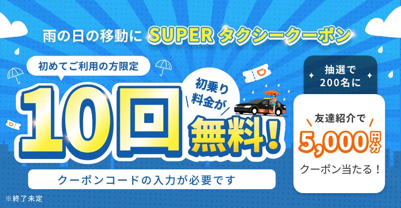 はじめての方限定「初乗り料金10回無料キャンペーン」誰でも友達紹介をすると抽選で200名に5,000円分のクーポンをプレゼント