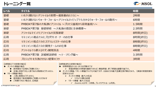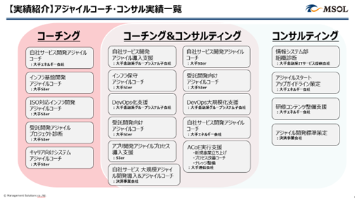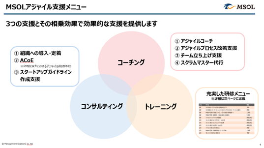 MSOLとしても、今後のビジネス活動においてアジャイルの果たす役割は欠かせないものとなっていくとの認識のもと、2020年度からDigital事業部内にアジャイルの専門家チームを設置し、コーチング、コンサルティング、トレーニングの3つを軸としたアジャイルソリューションサービスを展開し実績を積み重ねております。