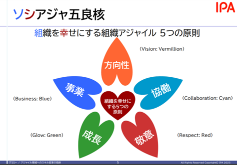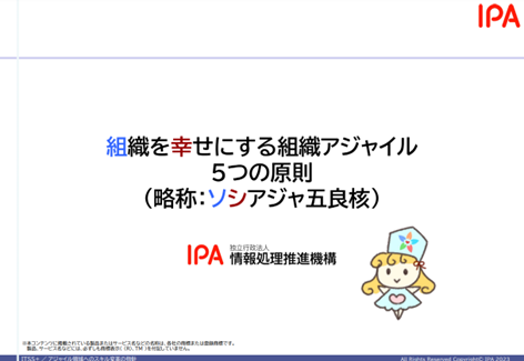 「個人や組織が輝き続けるために、さまざまな局面で組織自身がその存在理由をあらためて見直し、組織として意味のある機能を果たしていることが求められます。この「組織を幸せにする組織アジャイル 5つの原則(略称:ソシアジャ五良核)」は、こうしたさまざまな変化の中で、組織や個人がどのように取り組めばよいかについて「考えるヒント」となるものです。 ~ IPAのHPより ~」
