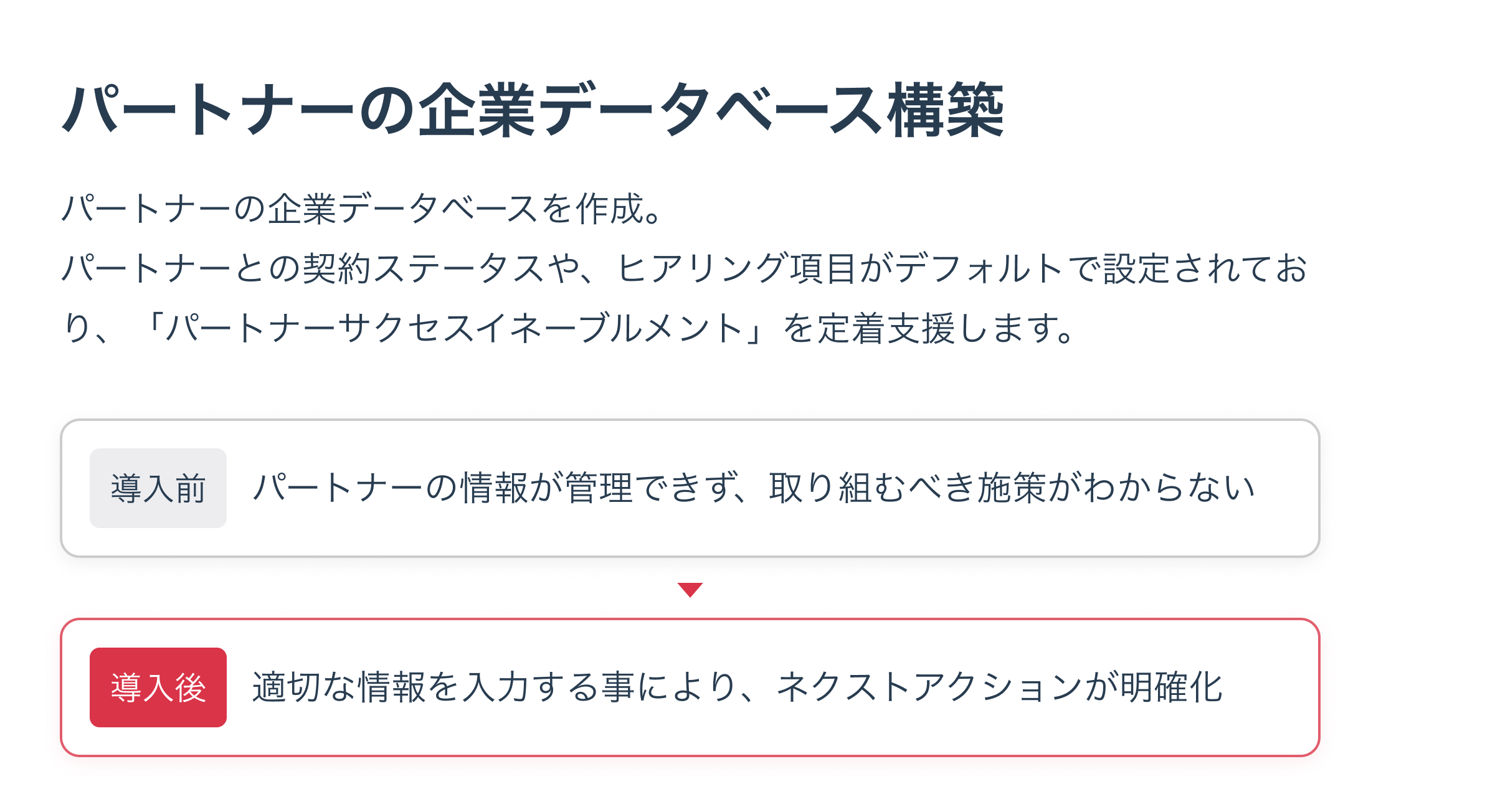 マーケティング施策などを取り組む際にも、どのパートナーと実施すべきかを網羅できる管理体制が必要です。