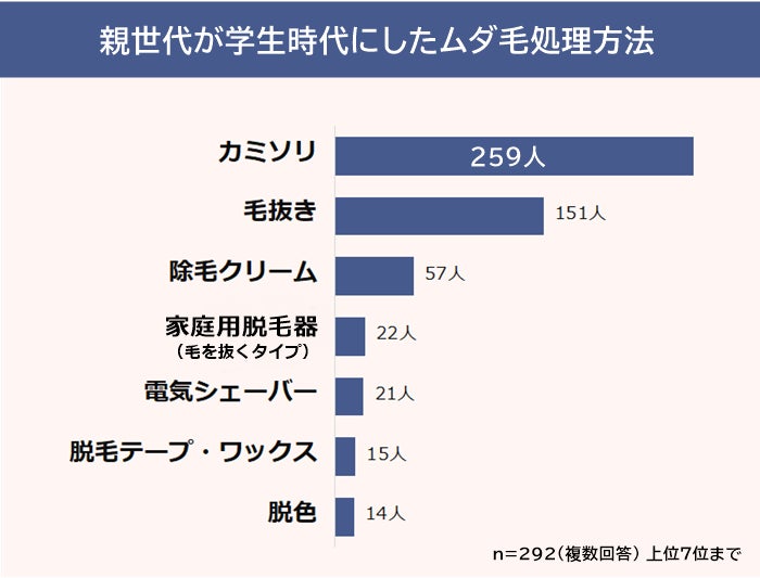 親世代が学生時代にしたムダ毛処理方法1位は「カミソリ」